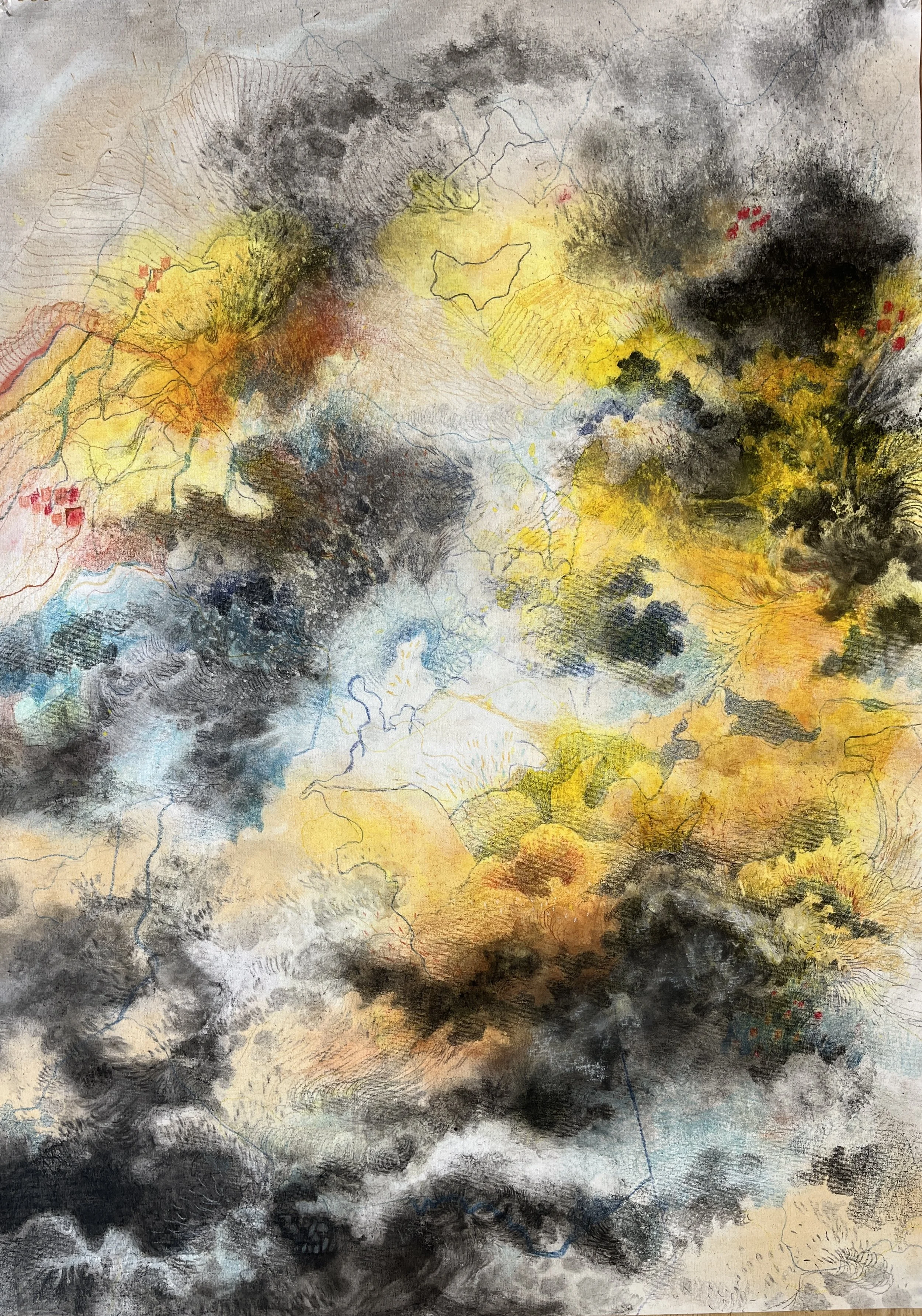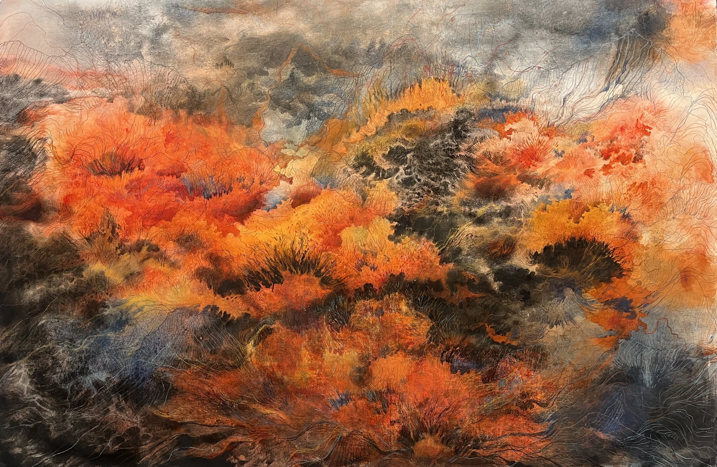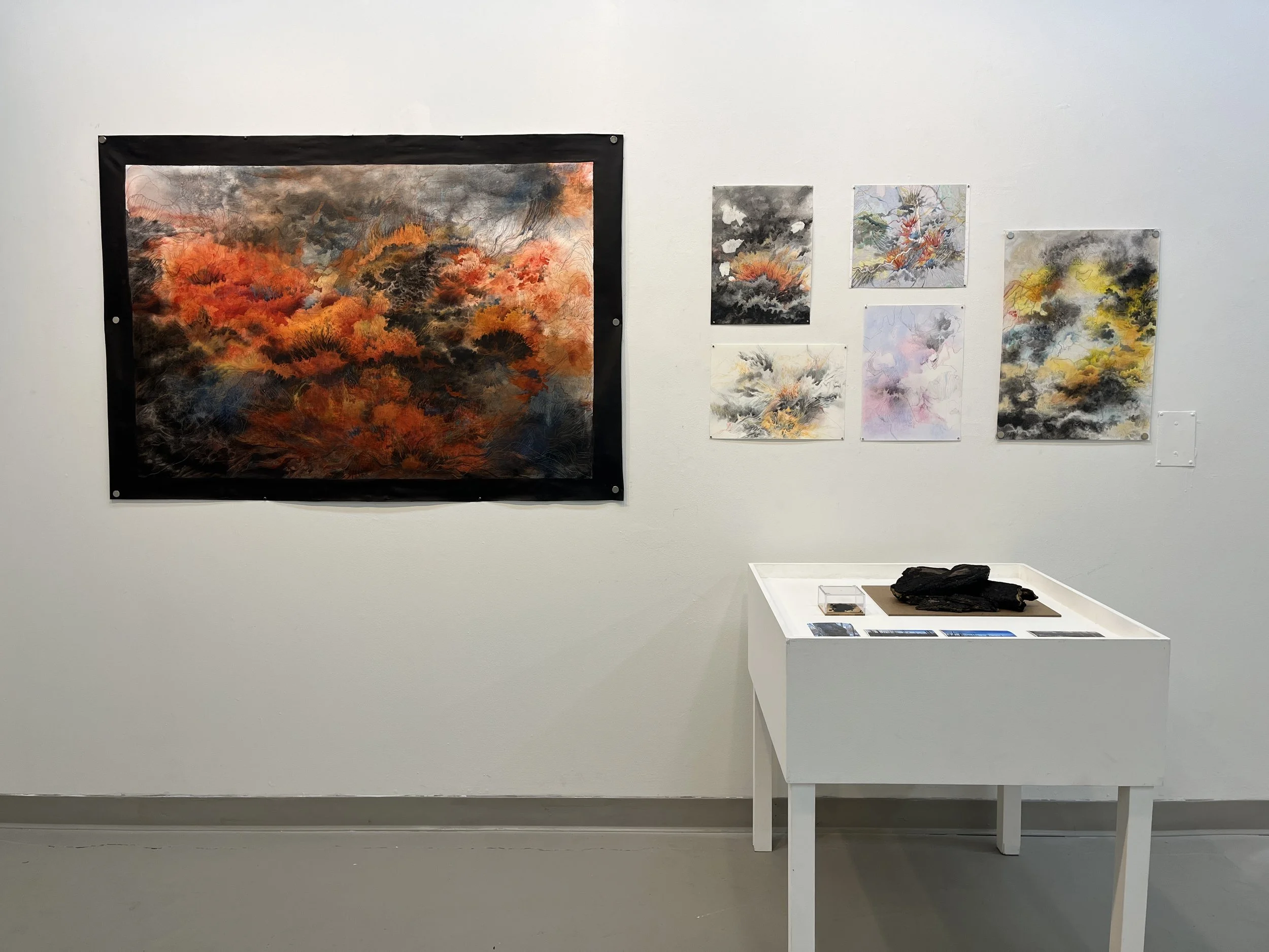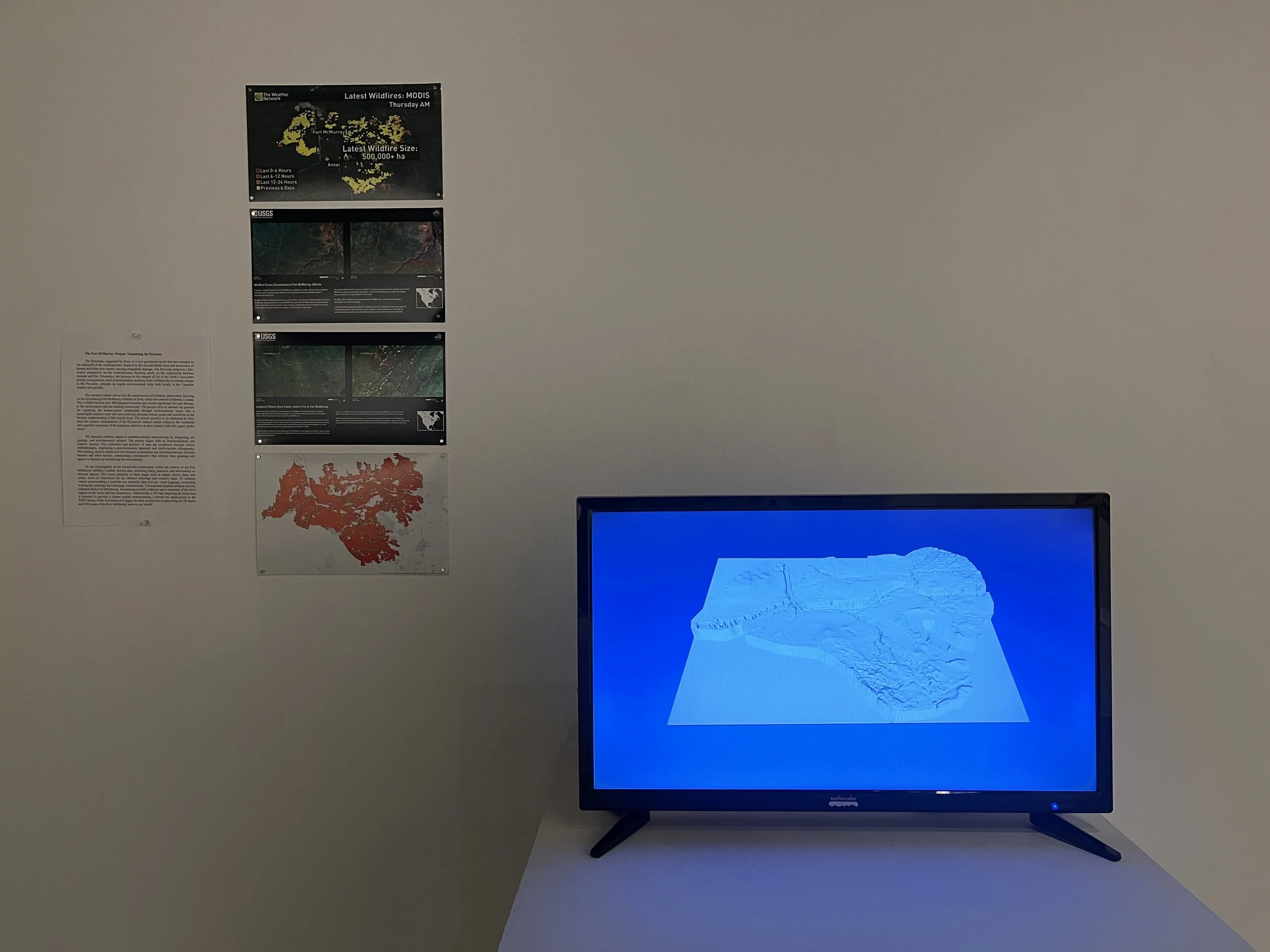 In my investigation of the human-fire relationship within the context of the Fort McMurray wildfire, I collect diverse data, including maps, statistics, and information on relevant species. The visual elements of these maps, such as shapes, forms, lines, and colors, serve as inspiration for my abstract drawings and creative maps. To enhance viewer understanding, I translate raw scientific data into my visual language, presenting it alongside paintings and drawings. Intentionally, I incorporate tangible artifacts directly collected from Fort McMurray, functioning as both evidence and a memorial of the fire's impact on the forest and the community. Additionally, a 3D map depicting the burnt area is included to provide a clearer spatial understanding. I extend my appreciation to the TDFL library of the University of Calgary for their pivotal role in generating the 3D model and GIS maps of the Fort McMurray area on my behalf.